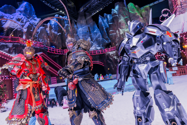 当潮流音浪“撞击”千年非遗,2025年的最后一夜,太仓阿尔卑斯国际度假区更是倾情了呈现一场“冰火双生舞台”精彩演出。跨年夜当天,冰雪燃灯跨年音乐会现场还特别打造了限定版冰雪燃灯舞台,与非遗舞台表演交替进行。冰雪燃灯舞台特邀DJ+MC、全能唱跳yolo男团嗨翻全场,更有机甲战神天团助阵,携手带来震撼的潮流视听体验。整个表演从下午5点一直持续到1号0点30分,让游客在这场“冰火双舞台巅峰对决”的名场面中辞旧迎新、共贺新年。