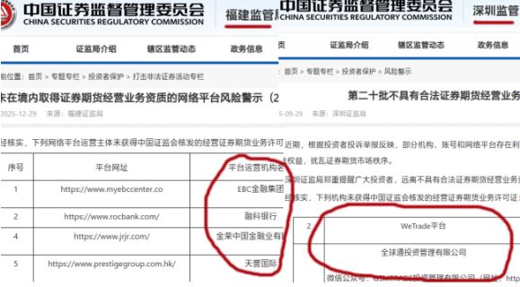 对如此类拥有海外牌照而没有任何中国内地金融证照的平台机构,近日证监会各管局相继发布风险预警,将诸如IC Markets,WeTrade,rocbank,EBC等多家无内地合法金融证照平台机构列入风险警示黑名单。