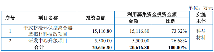 为把握市场机遇,科马材料本次 IPO 募集资金 20616.80 万元,重点投向两大核心项目,为长远发展蓄力。其中,73.32%(15116.80 万元)用于干式挤浸环保型离合器摩擦材料技改项目,项目达产后将新增 1000 万片干式摩擦片产能,有效缓解当前产能瓶颈,优化产能布局并提升生产效率;26.68%(5500 万元)用于研发中心升级项目,聚焦新能源摩擦材料、高性能湿式摩擦片等前沿领域,深化与客户的同步研发合作,持续推动核心技术迭代。